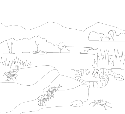 The pictres below show different habitats, and each has venomous four kinds of animals in it. You can print out a full-size version for colouring in just by clicking "print picture" below each. If you want help with colours, you can click on the colour version.